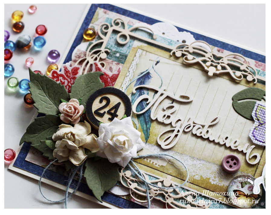 Начнем с материалов: коллекция бумаги "Бохо" ScrapBerryes, чипборд "Поздравляю" и "Рамка большая 2" от студии чипборда "Скрапля", деревянная фишка 24, цветы, вырубка и акриловые капли))